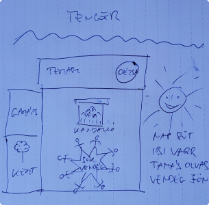 Álmaink háza: Kicsi, kedves, patent otthon. Ibinek alkotószoba, Tamásnak iroda és könyvespolc. Vendégszoba, hogy jöhessenek a barátok. Kandalló, tágas közös tér (konyha, étkező, nappali egyben). Egyszintes, se emelet, se pince. Tengerpart, napsütés, kellemes langy meleg idő, tágas terasz a reggeli kávézásokhoz, az esti beszélgetésekhez és a grillezéshez a barátainkkal. A teraszon dézsa. Ibinek egy kiskert a fűszernövényeknek. Tamásnak egy garázs barkácsoláshoz.